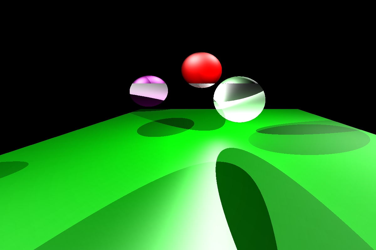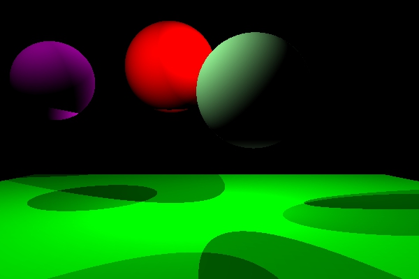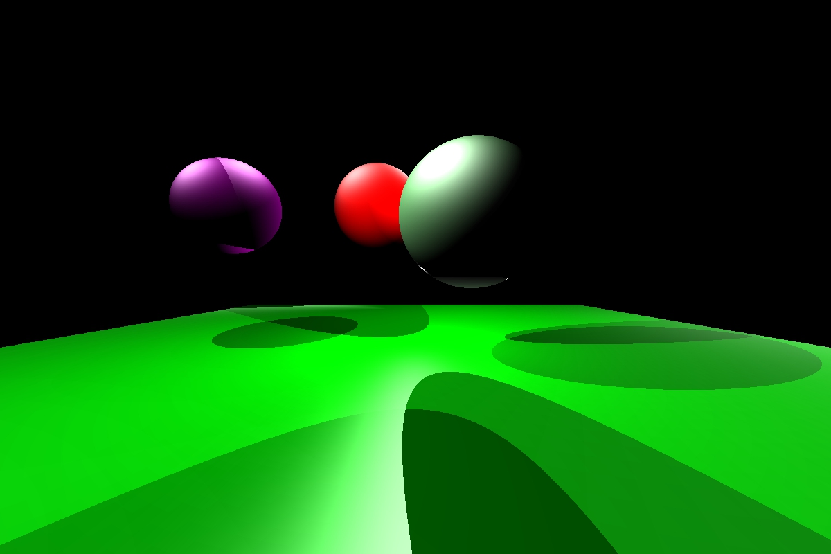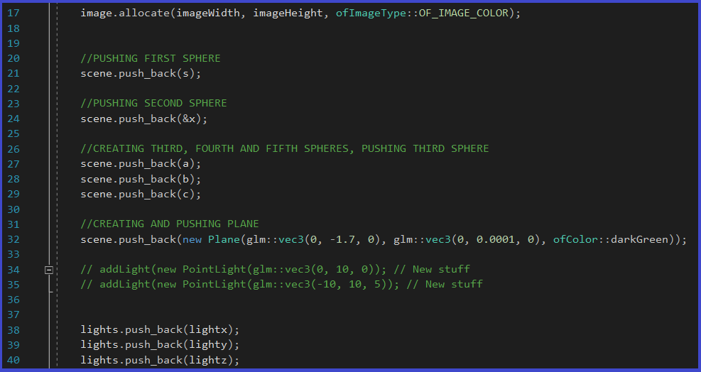 I then create 3 different spheres (the primitives chosen for this project), along with a floor plane. Each sphere is initialized with a different color, and pushed unto the scene.