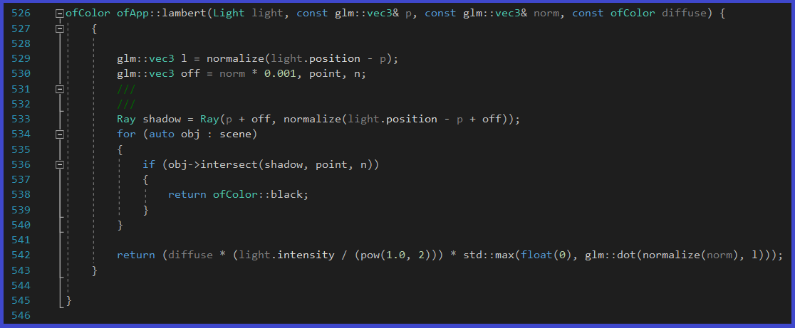 I added to this project a Light class, in order to be able to to add Lambert and Phong shadding. For the lambert shadding, we have the following function: