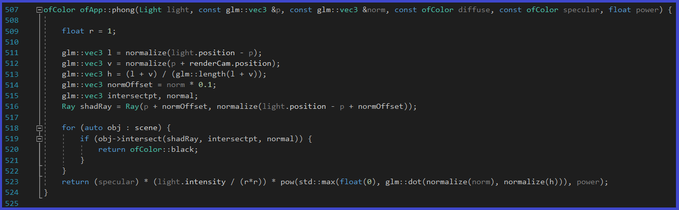 where p is the point of intersection, norm is the normal and diffuse is the diffuse color of the scene object. For the Phong shadding, we have: