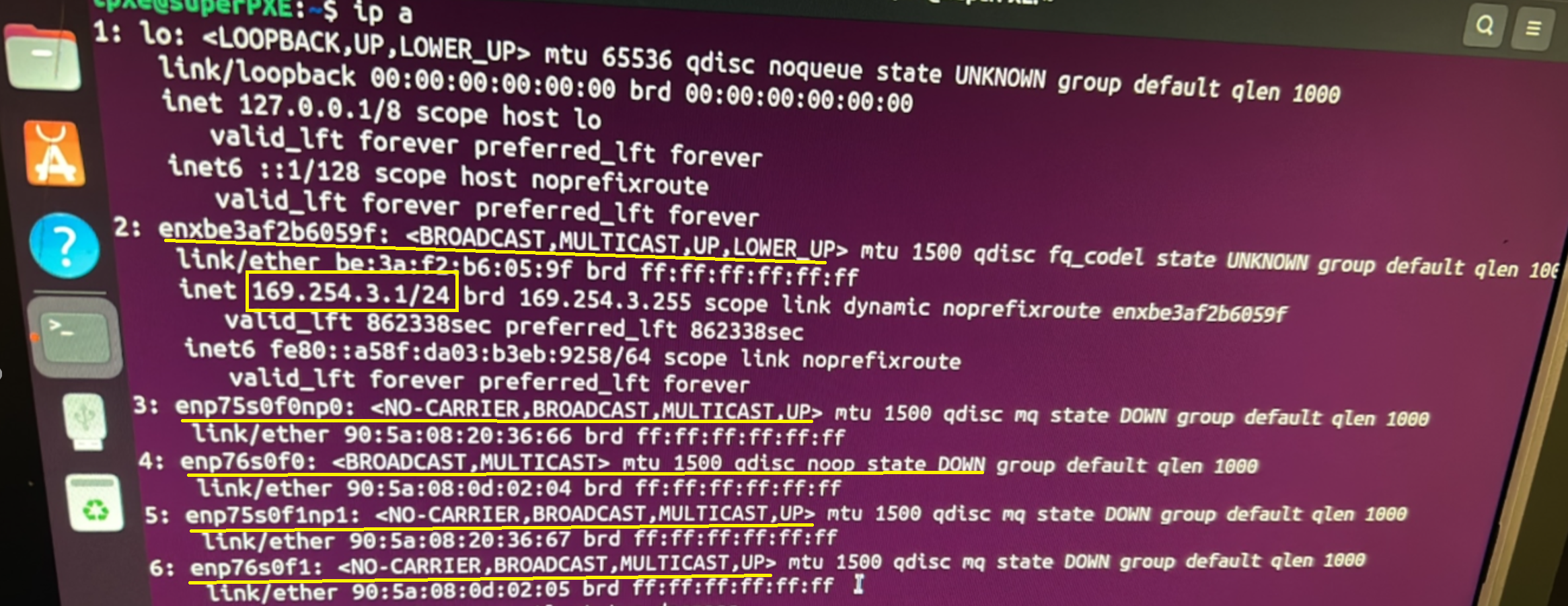 Looking at the current network configuration, we see that only enxbe3af2b6059f has an IP starting with 169.254, indicating that very likely, this system had issues communicating with DHCP: