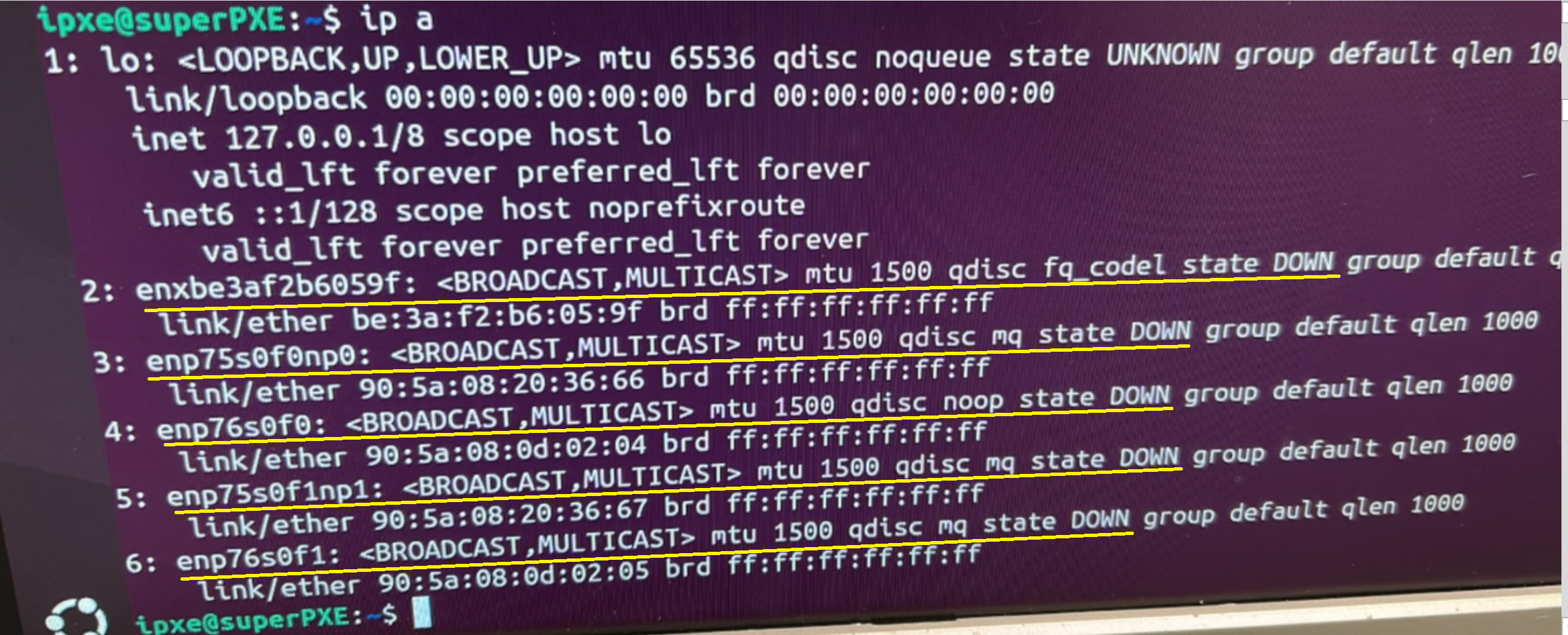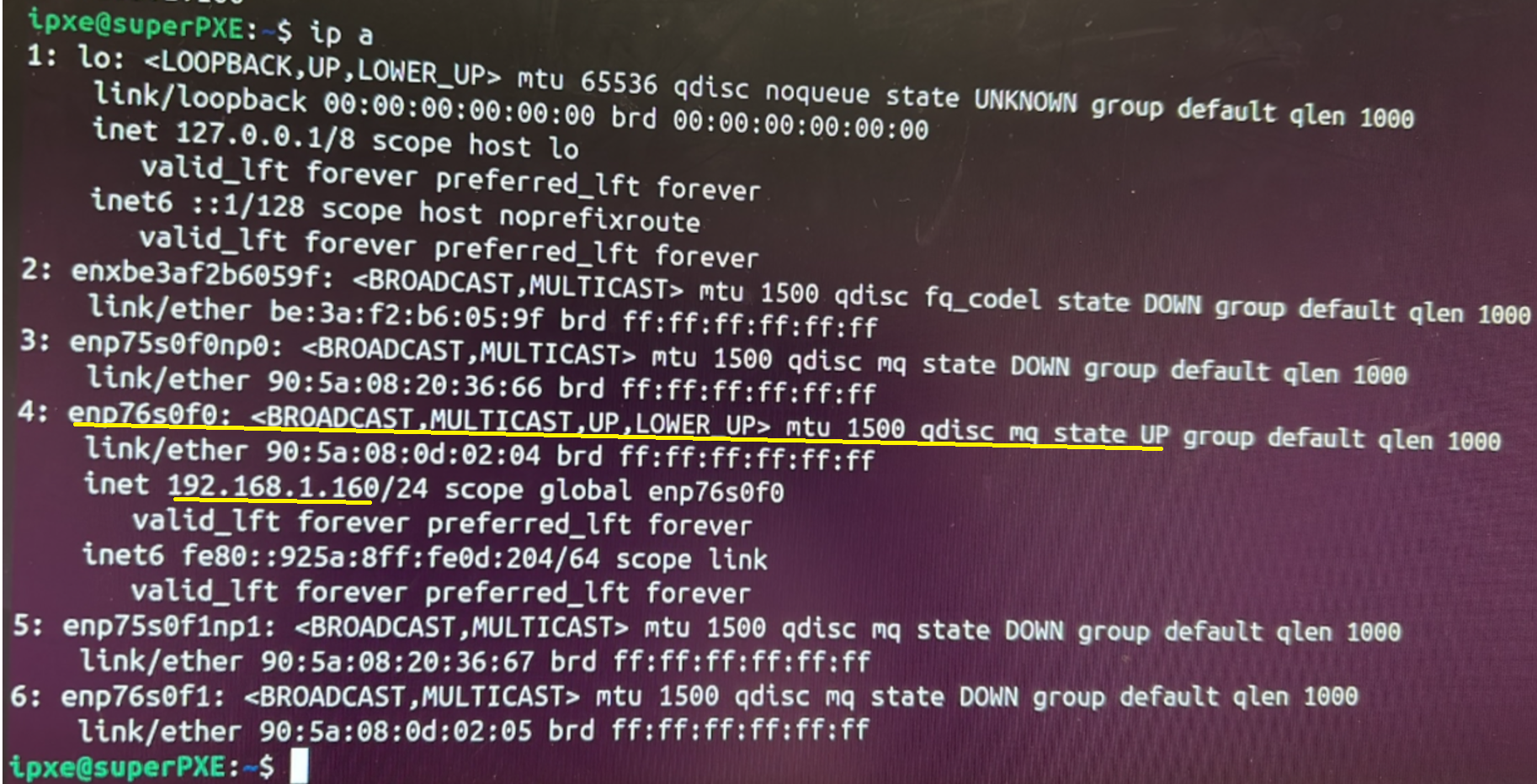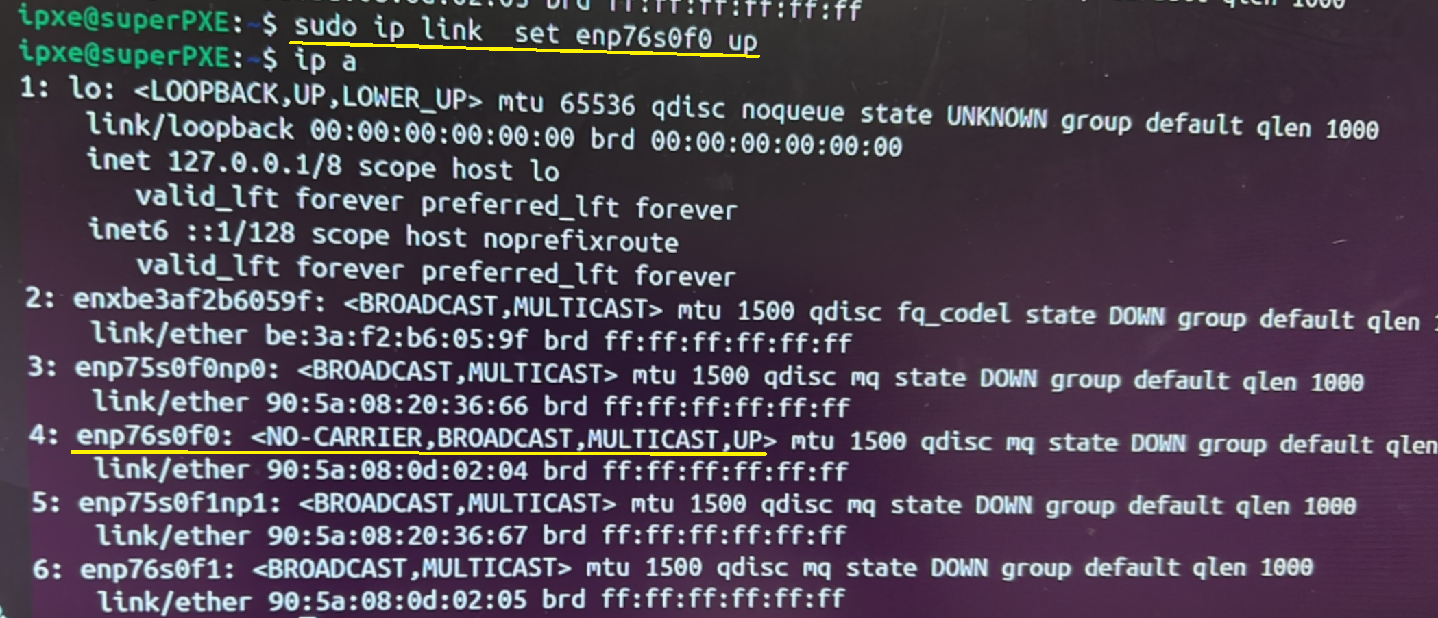 We then set enp76s0f0 to up. ip a confirms our command worked: