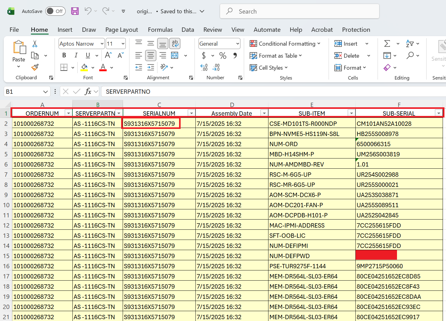 1- Start with origin1.xlsx, which contains repeated rows per server serial because each row represents a different sub-item or component.