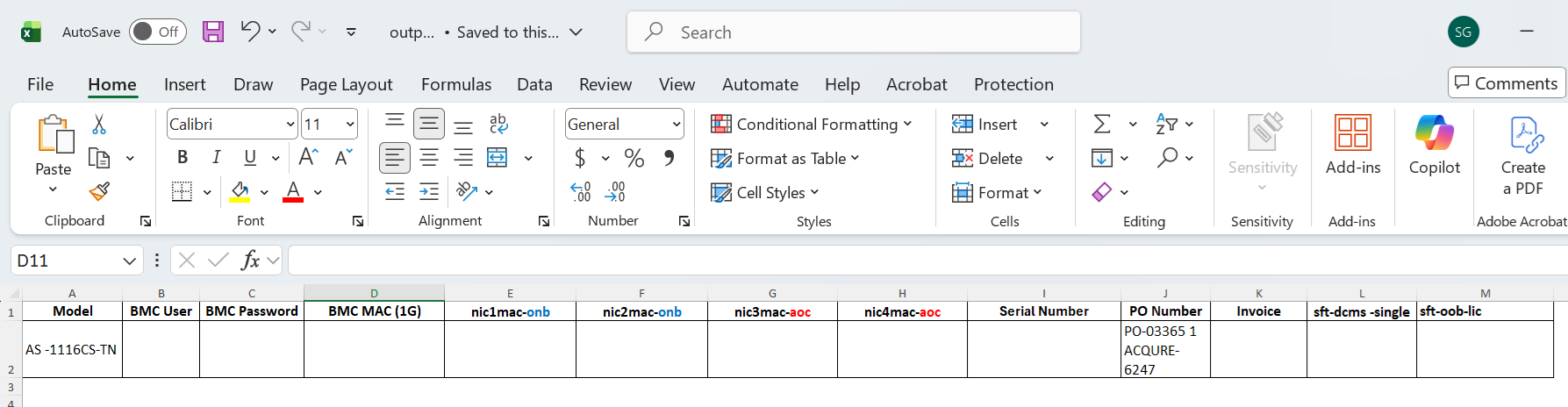 8- It maps those extracted values into the correct target columns in output1.xlsx, such as Model, BMC Password, BMC MAC (1G), and the NIC MAC fields.