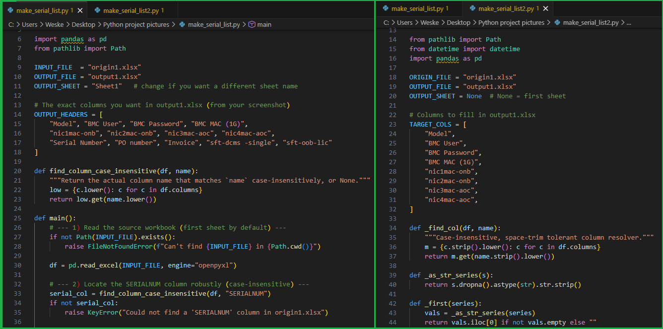 Together, the two python scripts (make_serial_list.py and make_serial_lis2.py), form a simple data-processing pipeline: the first script reads the detailed origin1.xlsx file (which contains many repeated rows per server) and extracts a clean list of unique serial numbers, generating a structured template output1.xlsx with only the “Serial Number” column filled; the second script then takes that template, looks up each serial number back in origin1.xlsx, pulls relevant information such as model, BMC user/password, and various MAC addresses based on specific sub-item rules, and fills in the remaining columns—resulting in a final, organized spreadsheet with one complete row per server.